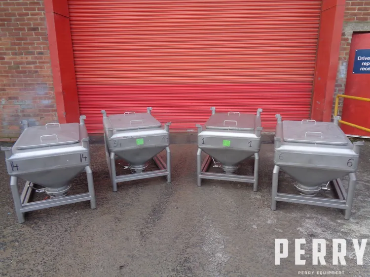 Balíček 4 použitých nerezových IBC nádrží o objemu přibližně 250 litrů. Vnitřní rozměry přibližně 1200 mm dlouhé x 800 mm široké x 100 mm rovný bok s 400 mm hlubokým kuželovým dnem. Namontováno na základně umožňující manipulaci vysokozdvižným vozíkem. Součástí je také spodní ruční motýlový vypouštěcí ventil.