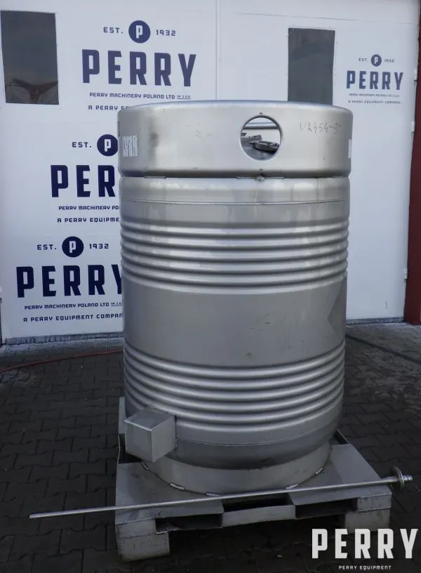 Použitá svislá nerezová ocelová (AISI 304) skladovací nádoba/kašna s objemem 1363 l. Nádrž má vnitřní průměr 1110 mm x délku rovné části stěny 1240 mm. Provozní tlak až 1 bar, konstrukční tlak 1,3 bar. Vrchní a spodní část svařované. Vrch má centrální vstupní/výstupní spoj. Nádrž je namontována na nerezovém rámu pro práci s vysokozdvižným vozíkem. Poslední použití v chemickém průmyslu.