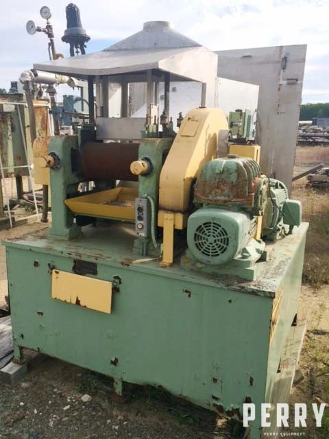 Used Reliable 8" X 16" 2-roll mill. Includes right-angle reducer and chain drive to mill. Has manually adjusted front roll and includes split edge guides and overhead and knee safety. Includes fume hood.