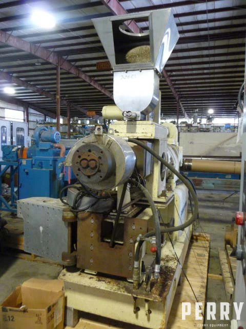 Used Creusot Loire (Clextral) model BC-45 twin screw extruder. Machine #750, Serial #5100750. 2 zones, 55 mm diameter screws. 45mm between shaft centers. Includes central console, pneumatic knife, powder feeder, tools, also spare parts. Rated 220 lbs per hour of snack or biodegradable product.
