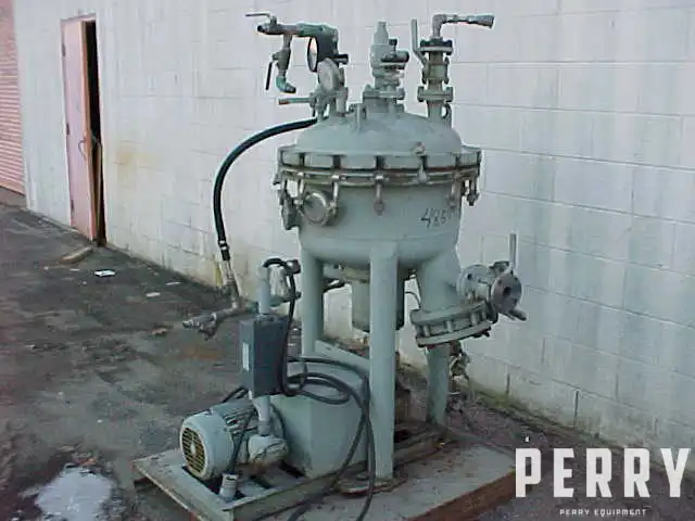Used Schenk/Votator stainless steel pressure leaf filter, approximately 30" diameter X 12" vertical tank, (7) 24" diameter horizontal leaves, rated 90 psi @ 300°F, equipped with 5 HP/3/60/220-440/1730 XP drive, with right angle drive, with shaft entering through bottom center unit has entering manifold, bolt on cover with swing bolts, lifting lugs, with (3) legs all mounted on base, National board #4266, Schenk S/N sf-13, Votator SN LSK-10-10.