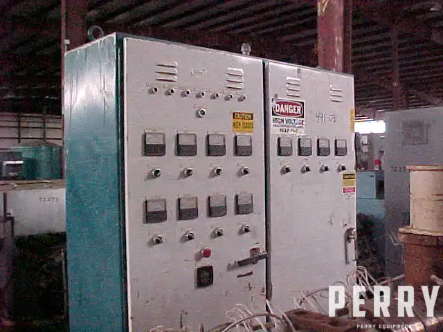 Used extruder temperature control panel previously used with 60 mm Krass Maffei twin screw extruder. No temperature controllers included but does include (12) amp meter and mercury contactors. Also included is 40 HP brushless DC drive, Sysmac model C40K programmable controller.