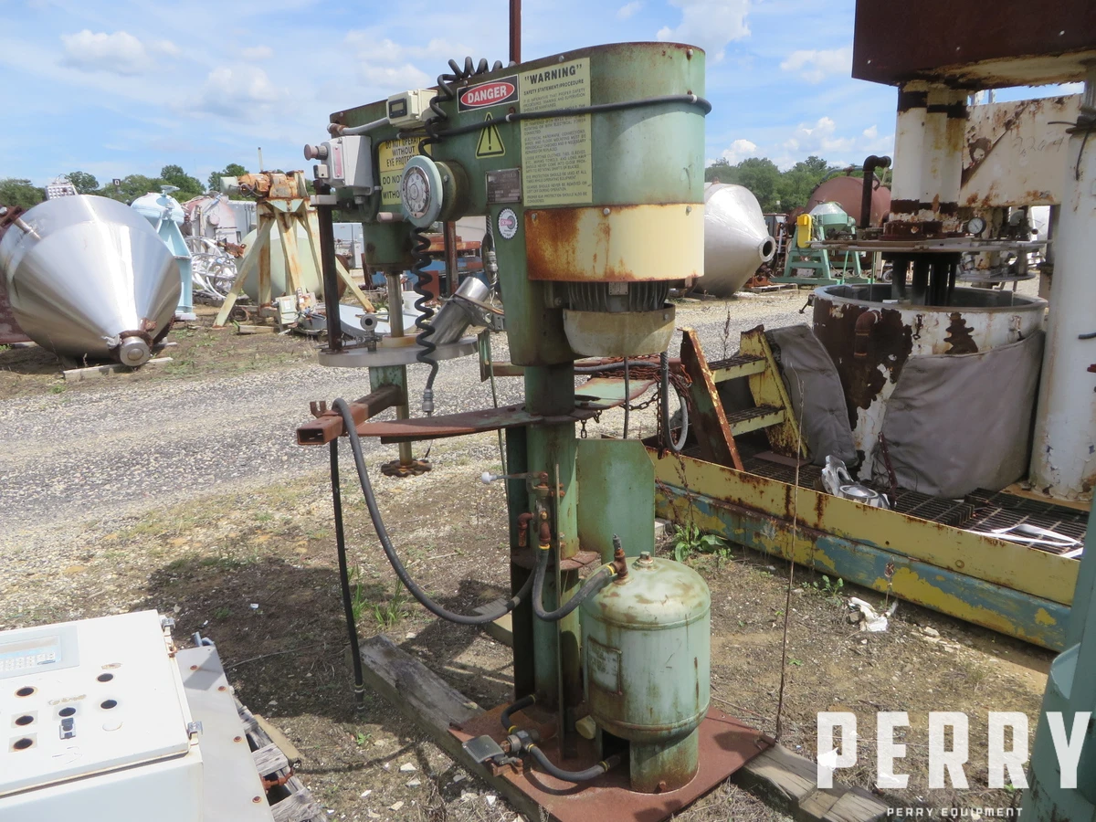 Used Schold stainless steel post mixer. 1.5 diameter shaft with 7" plastic disc blade. Equipped with 5 HP vari-speed belt drive. Range 600-3600 rpm. 3/60/230-460 volt. Includes (3) open top/Cone bottom 20 gallon stainless steel jacketed mix tank on casters. Foot pedal pneumatic lift with air tank.