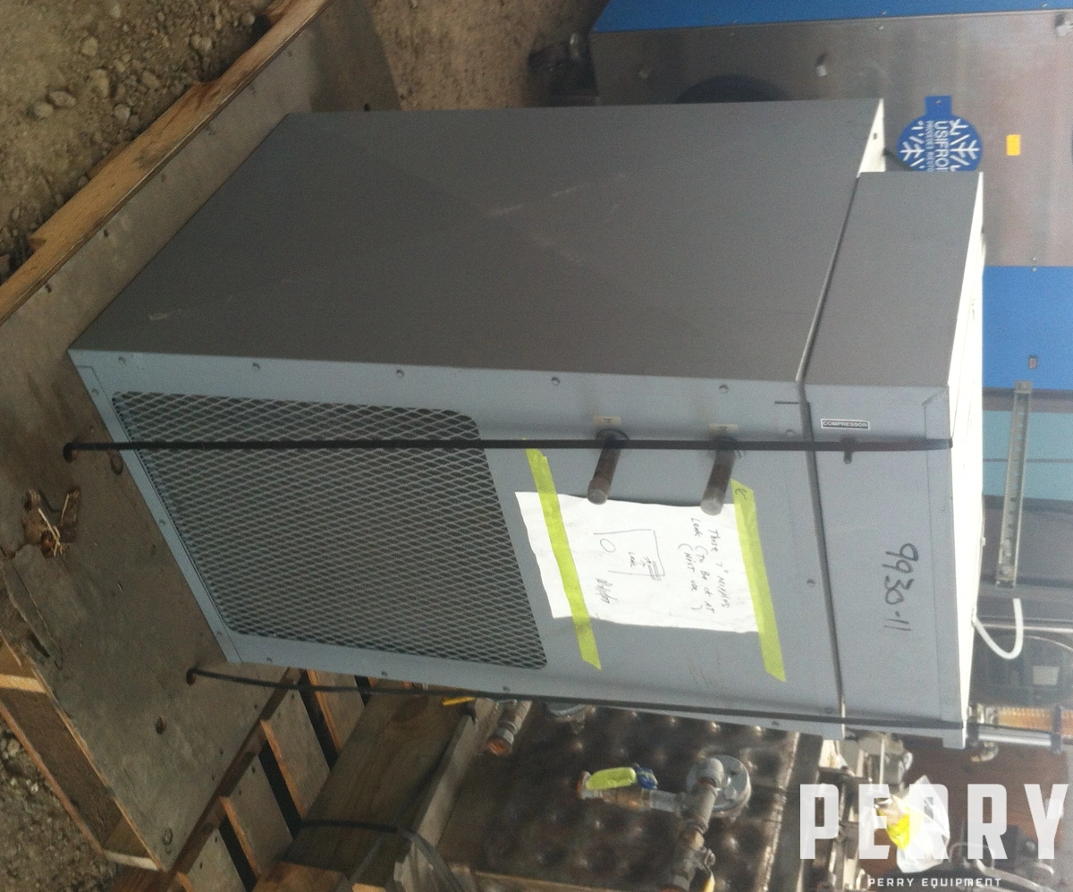 Used Dunham-Bush model CCP45A6 1 ton air-cooled chiller. 208/230 volts, 1 phase, 60 Hz. Test pressure high side 400 psig, low side 230 psig. Compressor motor 2.25 HP.
