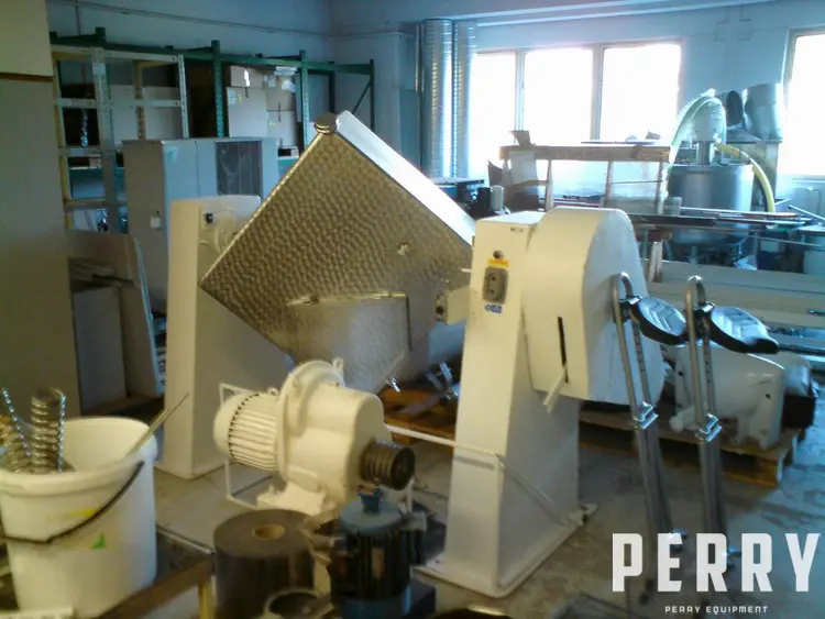 Used tumbling cube mixer. Total volume of mixing chamber 500 litres and about 250 litres working volume. Contact parts made of stainless steel. Chamber has dimensions: 800 X 800 X800 mm. Machine is driven by EL. Motor 7,5/11kW and 980/1470 rpm.