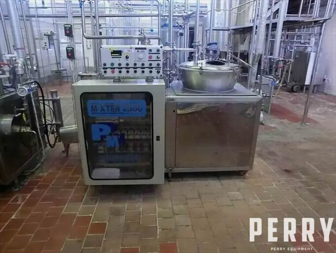 Used Machine PM Rybnik Model Mixter 2500 production line equipped to perform basic functions such as mixing aroma in the cheese, homogenization, stabilization, thermozation. Machine dimensions are 2000 mm X 1400 mm X 1700 mm. Machine weight is 395 kg. (depending on equipment), power consumption of 13 kW (depending on the device), vapor pressure max. 0.05 MPA, steam consumption 80 kg / H, the volume of technological input is 125 kg, thermisation time is 12-14min.