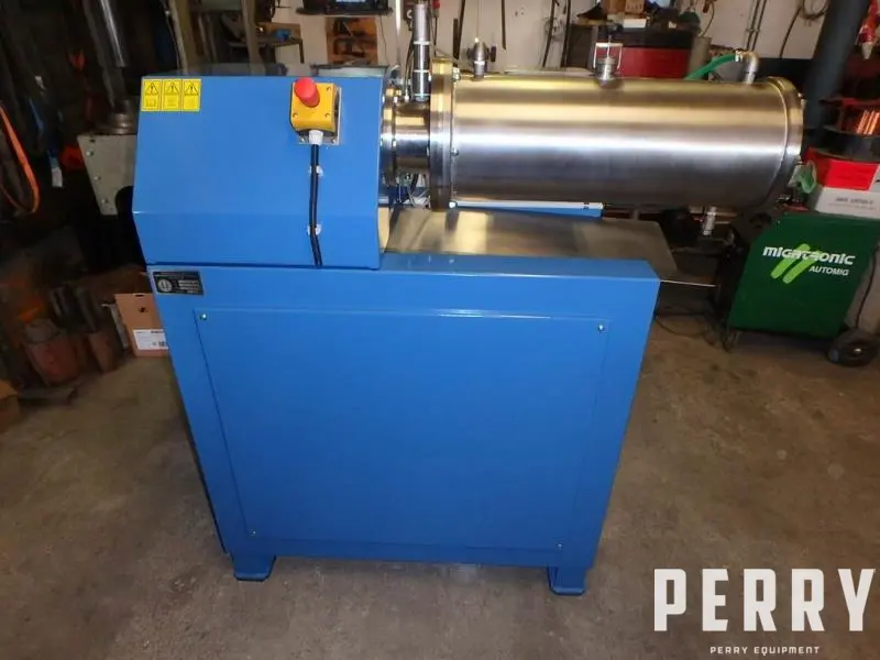 New PERRYmix model PD25-Z stainless steel horizontal bead mill. Stainless steel (Aisi 304) jacketed milling chamber has capacity 25 litre and inside measures 232 mm diameter X 690 mm length. Stainless steel shaft with (8) polyurethane discs diameter 185 mm driven by EL. motor 22,0 kW/400 V/50 Hz/IP55. Fixed shaft speed 1100 rpm and has a water cooled mechanical seal. Screen type of milling beads separation. Equipped with integrated EL. Switchboard and operating panel on machine. Includes varispeed gear pump.