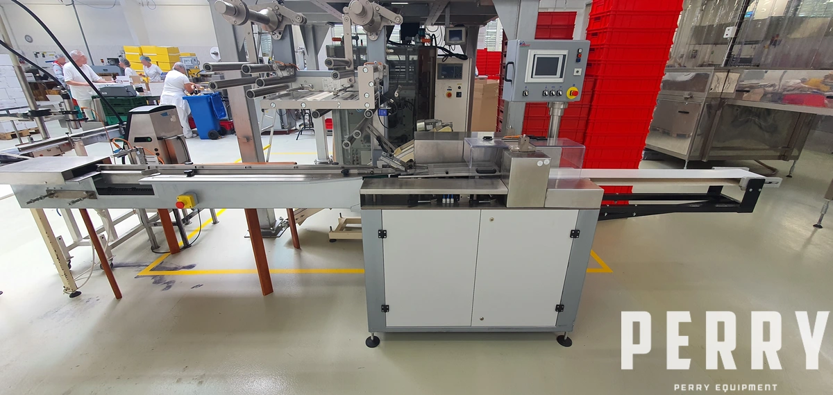 Used Chemosvit model BH-07W horizontal packing machine. The packing machine is suitable for packaging products with regular shapes and suitable strengths such as chocolate, waffles, gingerbread, soap, bandages, etc. The packaging capacity is about 15 - 250 pcs/min depending on the type of packaging material and cutting length. Dimensions of packaged products 50-350 mm length x 4-60 mm height x 20-120 mm width. Required power input 5 kW, 400 V, 50 Hz. Touch screen control. The basic dimensions are 3510 mm length x 706 mm width x 1767 mm height, weight 560 kg. Made in 2017.