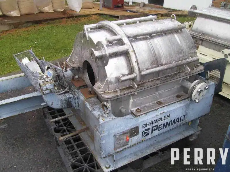 Used Sharples model P2000V decanter centrifuge parts comprising: frame, stainless steel casing and bedplate. Nameplate details read: maximum bowl speed 3150rpm, solid heavy phase 2.1 SG.