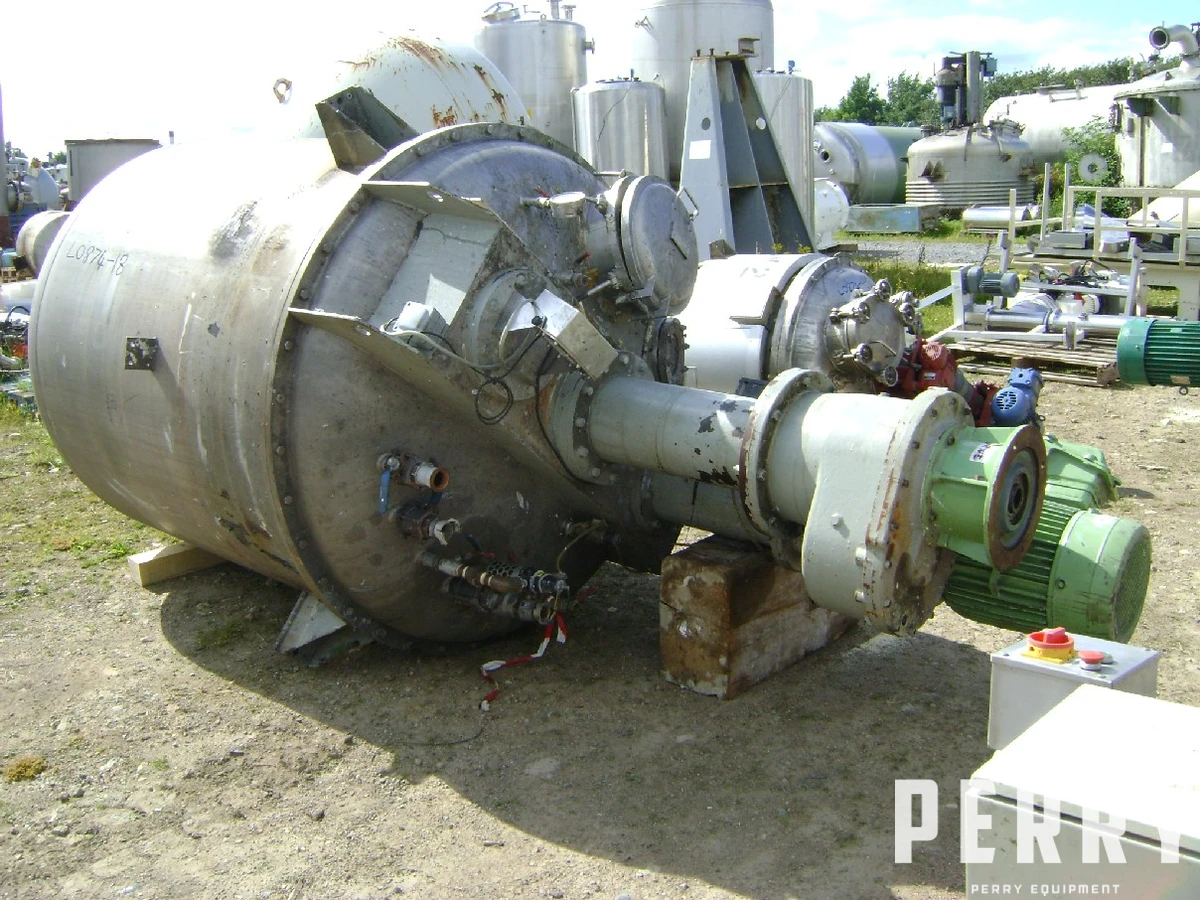 Used IVANS approximately 2,400 litre stainless steel vertical process vessel. Unit measures approximately 1560 mm diameter X 1480 mm straight side. Unit has bolted dished top and welded dished bottom heads. Internal rated 2 bar design pressure. Unit includes stainless steel anchor agitator with wall scrapers and 3-tier 2-blade pitched paddles direct driven by 15 kW 415 volt 3/50 960 rpm motor via CARL Bockwoldt gearbox rated 42.24/1 reduction ratio. Also includes stainless steel 3-tier 4-blade pitched paddle agitator direct driven by 18.5 kW 415 volt 3/50 1485 rpm motor and gearbox. Unit is mounted on (3) side support lugs.