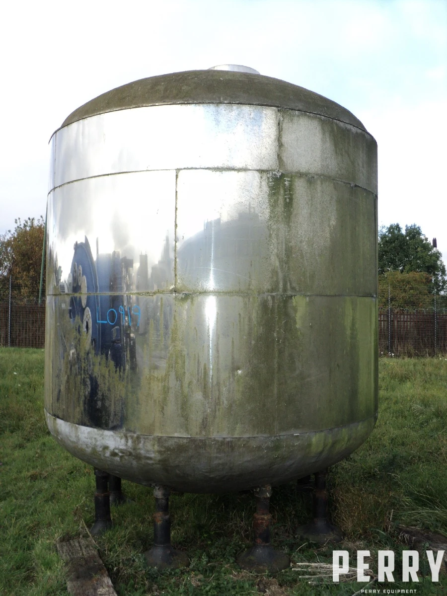 Used approximately 13,450 litre (82 UK barrel) vertical stainless steel storage vessel. Unit measures approximately 2600mm diameter X 2000mm straight side. Unit has welded dished top and bottom heads. Internal rated 2.76 bar working pressure. Mounted on (8) carbon steel legs. Unit is currently lagged and clad.