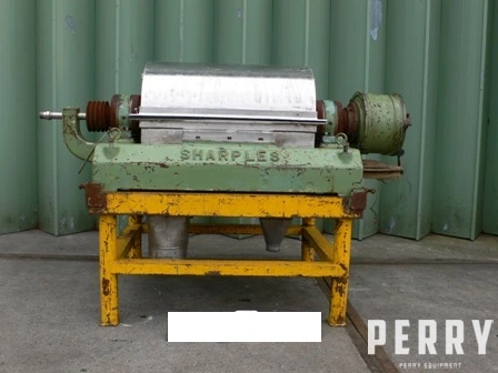 Used Sharples model P2000 stainless steel decanter centrifuge. Has 356mm diameter X 572mm long stainless steel bowl. Belt driven but no motor included. Maximum bowl speed 4000 rpm with 3180 G-force. Scroll driven via shaft mounted P125 epicyclic gearbox. Has stainless steel covers. Mounted on mild steel frame.