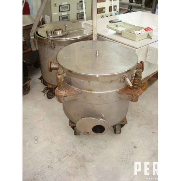Used 60 litre Talleres Miralles open top trolley tanks. Units measure approximately 450mm diameter X 400mm deep. Flat radius bottom to 75mm diameter outlet. Mounted on 4 wheel trolley base to give 540mm brim height.
