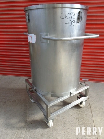 Used approximately 465 litre capacity stainless steel vertical storage vessel. Internal approximately 1000mm diameter X 770mm straight side. Has open top and welded flat bottom heads. Mounted on a frame with wheels.