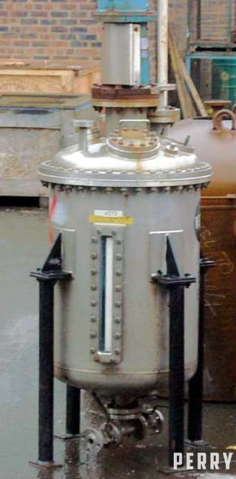 Used approximately 250 litre stainless steel vertical vessel. Stainless steel 316 (1,4401) vertical liquid storage tank / receiver with bolt dish top & welded dish bottom, 460 X 50mm sight / level glass on straight side. Rated 2,8 bar. Vessel measures 0,6M diameter X 0,78M H + 100 for bottom dish & 150mm for top dish + flanges. Openings top dish: 2 X 25mm, 1 X 75mm, 1 X 150mm flanges, 1 X 150mm pad, 1 X 200mm pad 1 X 100mm sight glass, centre bottom outlet: 50mm. Unit supported / mounted by 4 X side brackets / lugs positioned approximately 370mm from top dish split line lower face of brackets with bolt on/off pipe legs giving approximately 180mm floor clearance from underside of bottom outlet.