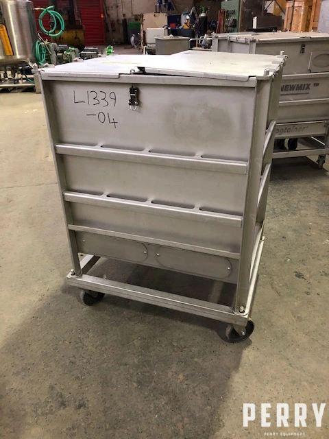 Used approximately 230 litre stainless steel mobile bin. Measures approximately 520 mm wide x 720 mm long x 610 mm deep. Mounted in frame with wheels.