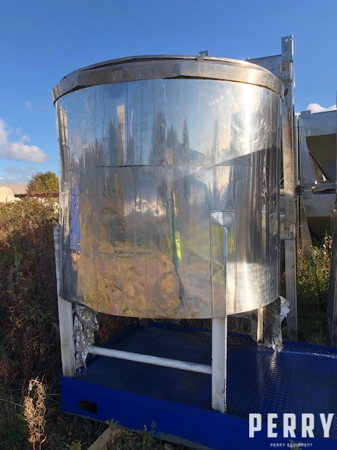 Used approximately 2,200 litre stainless steel vertical tank. Unit measures approximately 1500mm diameter x 1200mm straight side. Has flat top with half hinged lid and welded conical bottom heads. Straight side is lagged and clad. Unit is mounted on (4) legs. Last used for storing olive oil.