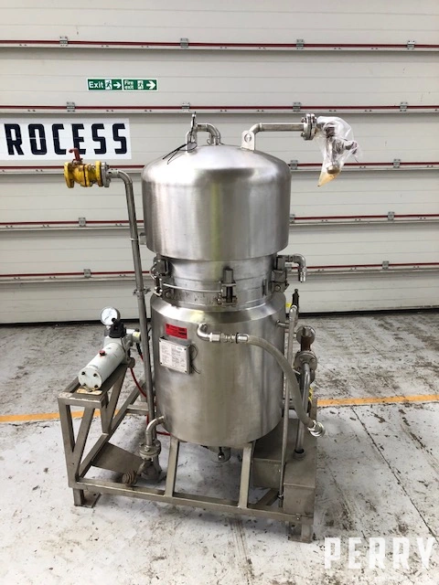 Used Eurofiltec Model 450 stainless steel pressure leaf filter. Has 450mm diameter filter plates with approximately 2.4 square meter filtration area. Internal rated 7.5 bar/full vacuum design pressure at 171 deg.c. External stainless steel jacket rated 7 bar/full vacuum design pressure at 171 deg.c.