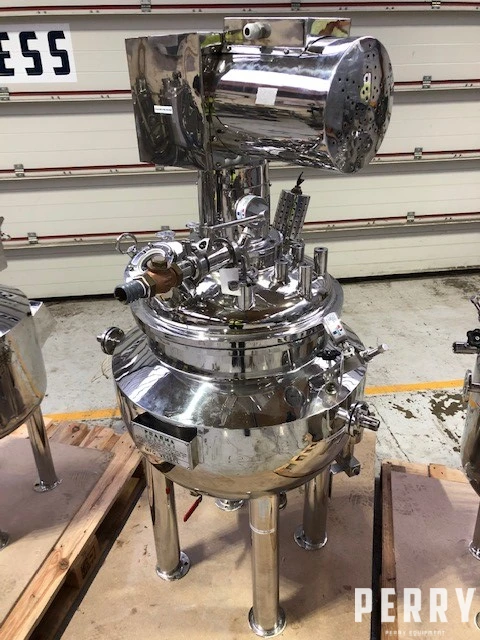 Used Anvay Pharma approximately 75 litre total and 60 litre working capacity 316 stainless steel vertical jacketed process vessel. Unit has dished top and welded dished bottom heads. Internal rated 2 bar design pressure. Jacket rated 2.5 bar design pressure. Unit has top entry stainless steel anchor type agitator driven by a 0.75 kw motor and also bottom entry homogenizer driven by a 1.5 kw motor. Unit is mounted on (4) legs.