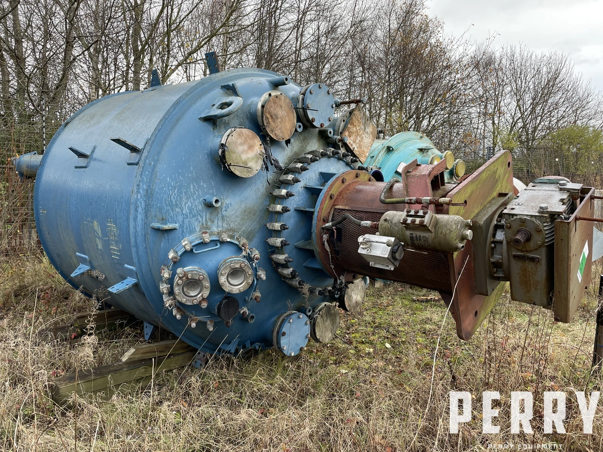 Used DeDietrich model CE10000 vertical glass lined reactor. Approximately 10,000 litre working capacity & 11,710 litre total capacity. Internal rated 6 bar/full vacuum design pressure at -25 to 200 deg.c. External mild steel jacket rated 6 bar/full vacuum design pressure at -25 to 200 deg.c. Unit has welded dished top and bottom heads. Top entry 3-blade retreat curve agitator with drive. Unit is mounted on (4) legs.
