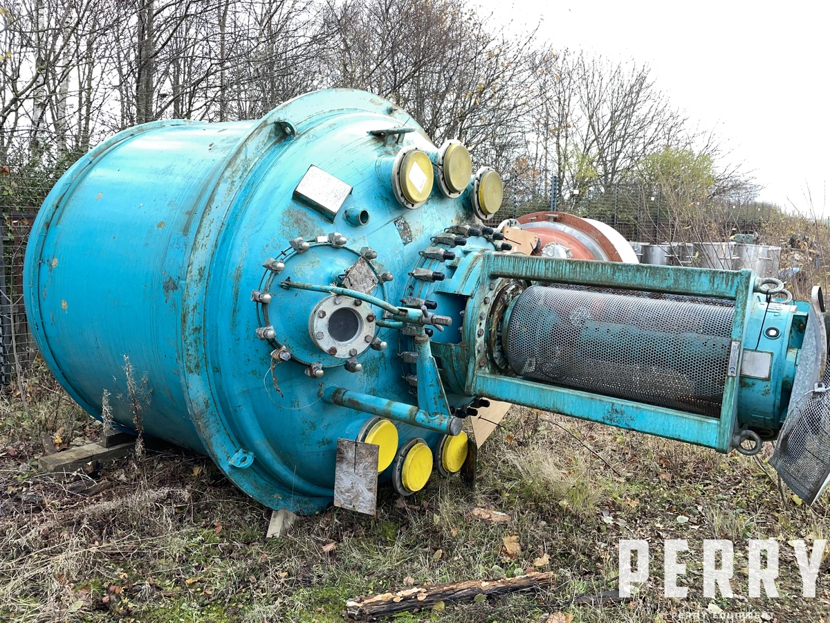 Used Pfaudler model CE10000 vertical glass lined reactor. Approximately 10,000 litre capacity. Internal rated 6 bar/full vacuum design pressure at -29 to 200 deg.c. External mild steel jacket rated 7.5 bar/full vacuum design pressure at -29 to 200 deg.c. Unit has welded dished top and bottom heads. Top entry 3-blade retreat curve agitator with Pfaudler VSO gearbox and drive. Unit has mild steel mounting ring.