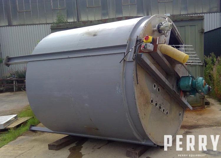 Used approximately 10,000 litre stainless steel mixing vessel. Unit measures approximately 2300mm diameter x 2560mm straight side. Unit includes internal stainless steel heating/cooling coil. Top entry 2 tier 4 blade agitator direct driven by a 2.2 kw 1415 rpm 415 volt 3/50 motor. Has flat hinged top and welded dished bottom heads. Mounted on (4) legs.