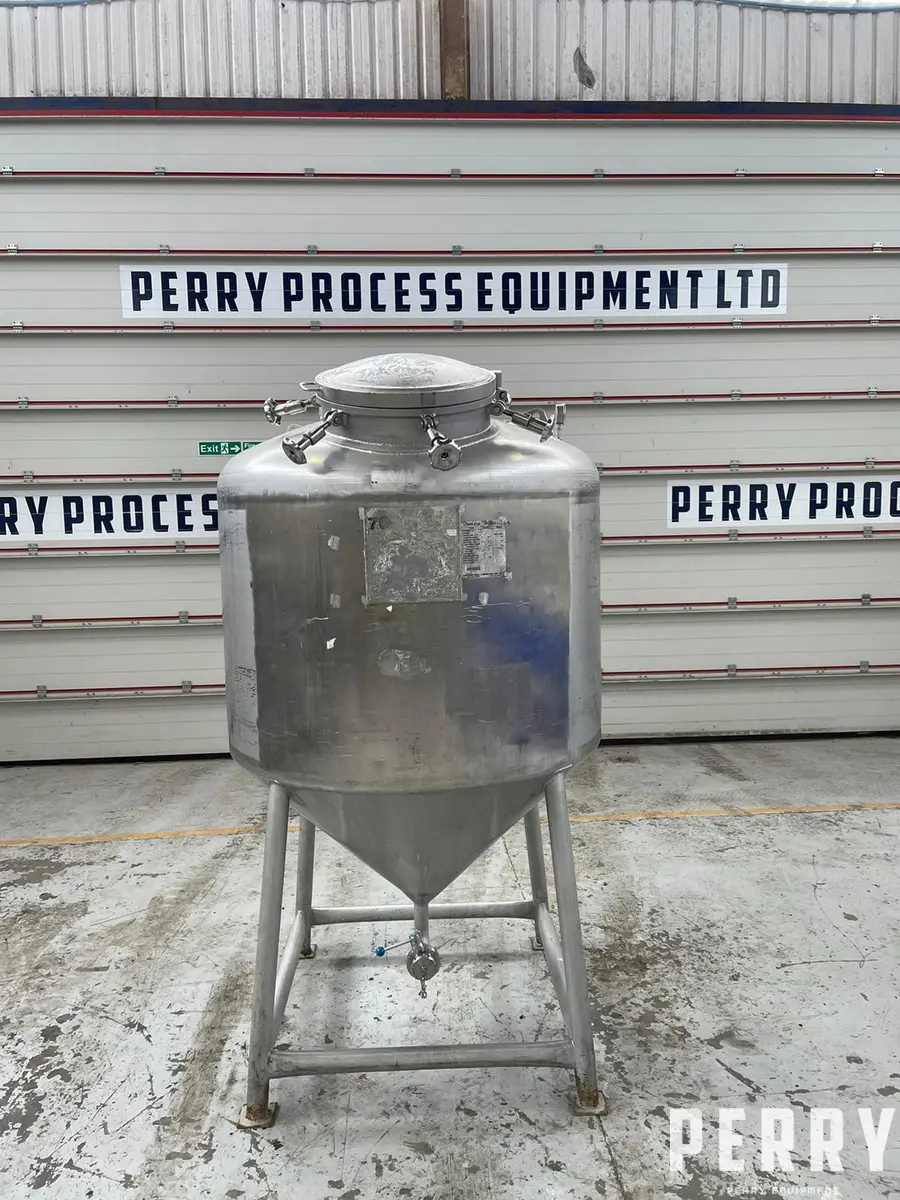 Used Stainless Services Ltd approximately 1,370 litre 316L stainless steel vertical storage tank. Unit measures approximately 1200mm diameter x 770mm straight side. Unit has welded dished top and welded cone bottom heads. Internal rated 2.5 bar design pressure at 150 deg.c. Unit mounted on (4) legs.