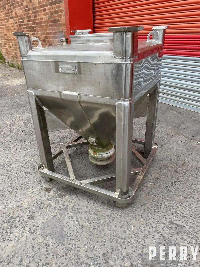 Used approximately 300 litre capacity (product dependent) stainless steel IBC. Unit measures approximately 800mm long x 800mm wide x 200mm straight side height with 600mm cone height.