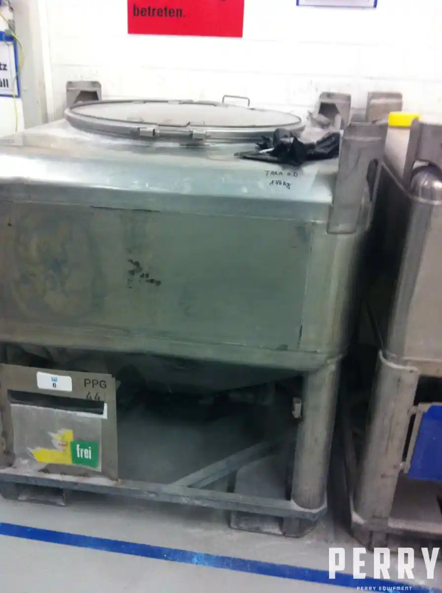 Used approximately 900 litre (1.4301) stainless steel containers with conical bottom. Mounted in a mild steel frame. Container measures approximately 1090mm X 1190mm.