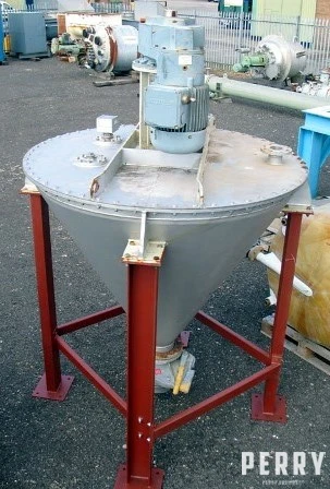 Used Engelsmann model KSM 600-14541-st 37/gm 600 litre (21,2ft3) stainless steel 321 (1,4541) Nauta type vertical Cone mixer. Unit includes: bolt on / off top cover, 7.5kW drive unit, packed gland, spiral ribbon blade, centre bottom outlet slide valve. Vessel measures: top diameter 1,7M, bottom diameter 200mm, vertical height 1,475M + 900mm for drive unit. Openings top: 2 X 80mm, 1 X 90mm, 1 X 240mm diameter product inlet. Centre bottom product discharge outlet 200mm diameter. Material thickness: Cone 4,0mm, top cover 8,0mm. Unit supported in a carbon steel box frame on 4 X side brackets / lugs positioned approximately 1,45M above lower face of discharge valve