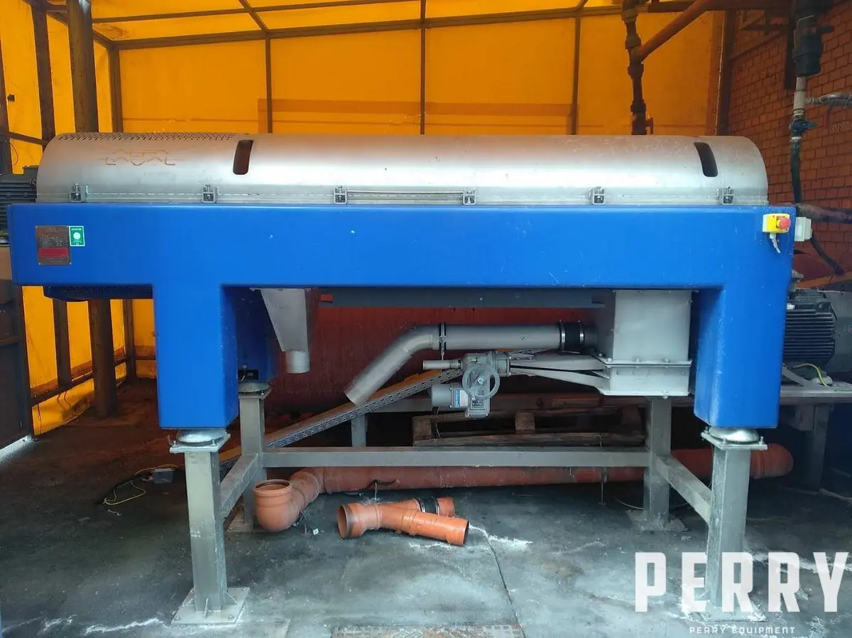 Used Alfa Laval model Aldec 45 decanter centifuge. Approximately 1.3 kg/dm3 max sludge density. Maximum bowl speed 4200 rpm. Feed temperature from 0 to 60 deg.c. Contact parts in 316 stainless steel. Bowl dimensions approximately 1,512mm long x 360mm diameter. Main drive rated 22kw, back-drive rated 5.5kw.