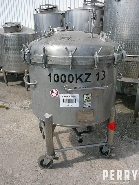 Used stainless steel mobile storage tank by Alfa Laval (Sweden) with total volume 1060 l. Tank has diameter 1200 mm x length of straight site of wall 770 mm. Conical bottom with discharge valve and height of cone 450 mm. Tank has a manway with diameter 355 mm and bolted lid. Unit is designed in stainless steel grade AISI 304 and rated for work on pressure range 3 bar. Mounted on four legs with wheels. Shipping dimensions: length 1300 mm x width 1300 mm x heigth 1900 mm.