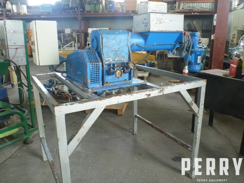 Used carbon steel cutter for plastics made by Mecanofil (Spain) with feeder screw conveyor. Screw feeder conveyor driven by 0,55 kW motor via bevel gearbox. Grinding chamber dimnesions: length 250 mm x diameter 170 mm. Has 2 static blades and screen perforation 6 mm. Rotor with 4 blades is driven by belt gearbox and elec. Motor 4 kW. Mounted on carbon steel frame. Includes control panel. Shipping dimensions: width 1200 mm x depth 1800 mm, height 1900 mm. No documentation. Weight: 720 kg. New 1999. No technical documentation.
