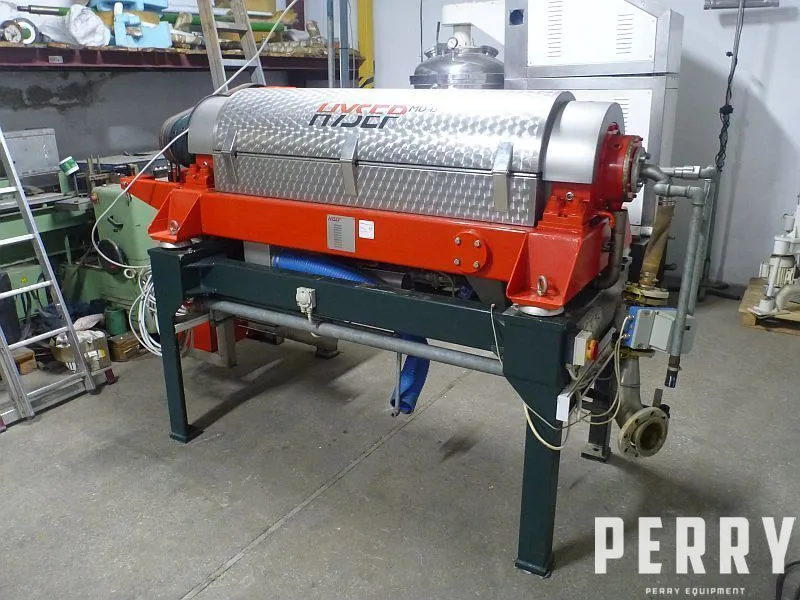 Used decanter centrifuge Hysep type MD43C with carbon steel bowl and screw. Internal surface of bowl and screw flinge are lined with Wolfram-Carbide. Bowl has a main drive 11/12.5 kW, 1455/1755 rpm, 50/60 Hz. Screw is driven by hydraulic motor with power 5.5 kW. Working rotation speed of bowl 2800 rpm. Maximal sludge density 1.2 kg/cubic meter, working temperature up to 80°C. Machine is mounted on integrated frame and is equipped with feeding pump, polimer dosing device. Bowl cover, discharges, and drive covers are designed in stainless steel. Technical documentation included.