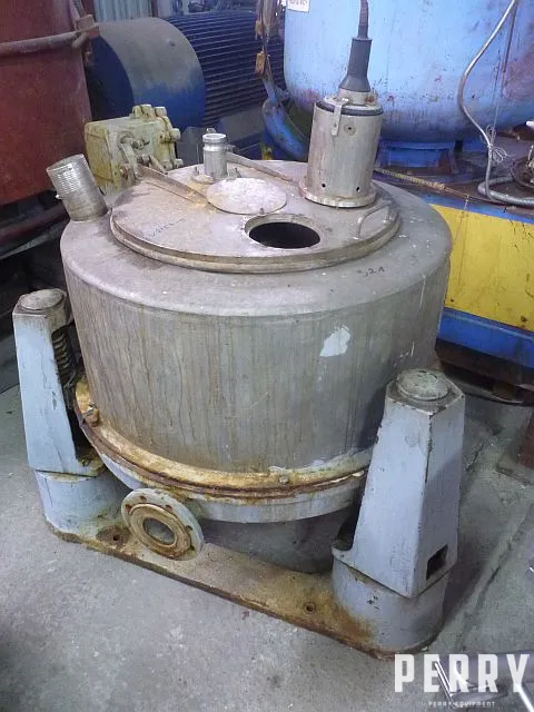 Used basket centrifuge by Sangerhausen (Germany) model FZPO 850C. Contact parts designed in stainless steel. Basket has a diameter 850 mm and depth 400 mm. Basket has filtration surface 1 M2 and volume 100 l. Working rotation speed 960 rpm, maximum work cycles - 6 per hour. Maximal basket filling - up to 75 kg. Machine is driven by el. motor 4 kW, 380V, 50 HZ. Machine is equipped with electric panel. Includes technical documentation.