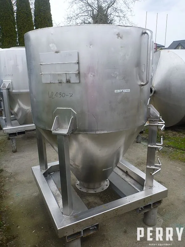 Used stainless steel vertical storage tank for powders with volume 1300 l. Tank has diameter 123 cm x length of straight side of wall 79 cm x height of cone 80 cm. Welded top has central feeding inlet with diameter 430 mm. Central bottom discharge has a diameter 250 mm. Mounted on 4 stainless steel legs, supported on stainless steel frame with handlers for fork lift.