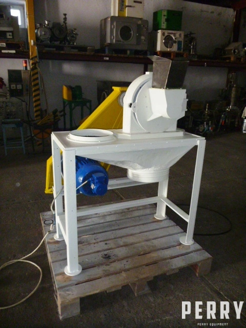 Used carbon steel universal mill. Unit has a cast iron rotor with a diameter of 320 mm and a cast iron stator with a diameter of 350 mm. Mill also is equipped with screen insert with diameter 365 mm. Mill is belt driven by EL motor 7,5 kW, 2920 rpm, 380 V, 50 Hz. Working rotation speed of rotor up to 6000 rpm. Machine is mounted on carbon steel pedestal. No technical documentation.