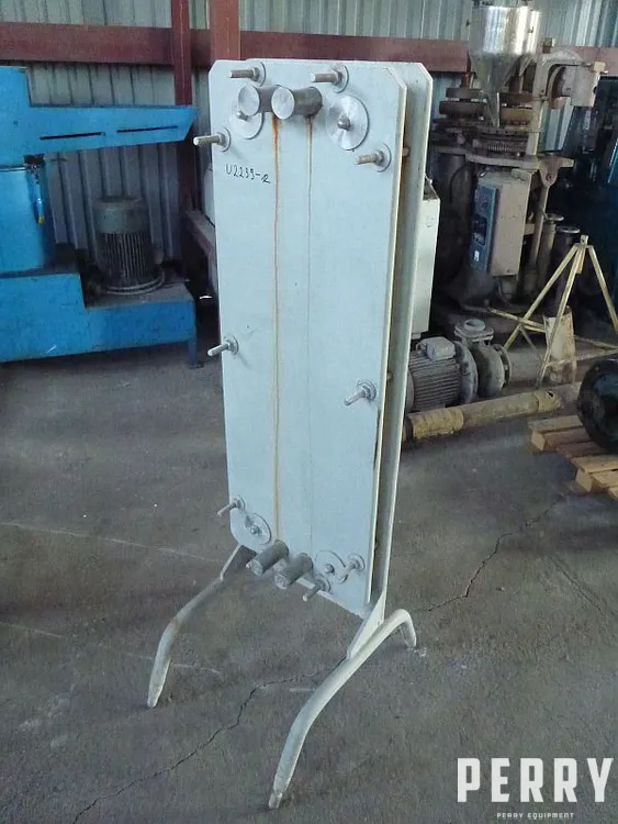 Used plate heat exchanger with surface approximately 4.37 square meter. Exchanger has side walls designed in carbon steel and 10 exchange plates designed in stainless steel. One plate has dimensions 1150 mm x 380 mm. Mounted on carbon steel legs.