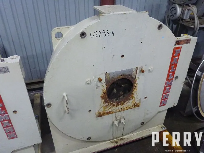 Used body of carbon steel grinding mill by Pallmann (Germany) model PR8. Equipped with bolted rotor and stator each with diameter 800 mm. Belt driven, but missing pulley. Manual adjustment of gap between milling plates. Front door bolted with central feeding inlet with diameter 185 mm through screw feeder chain driven via el motor 5 kW. Bottom discharge.