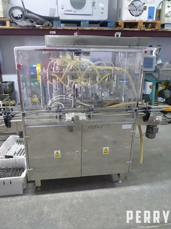 Second hand line filler by Vosko sp. z o.o. (PL). Machine has 4 nozzles simultaneously driven by electric. motor through the belt gearbox and screw. Each piston has internal diameter 60 mm x 100 mm , what gives approx. volume of each piston about 280 cm3. Machine has belt conveyer with width 100 mm x working length 1760 mm. Belt is designed in pp and has working speed adjustable via frequency converter. Machine has local control panel. Dose is adjustable for all four pistons via sensor which sets the upper and lower level of the piston stroke. Filler is equipped with mechanical capper. Capper is driven by el. motor 1.1 kW, 920 rpm, 230-400V, 50 hz and is equipped with belt conveyer with pp belt with width 100 mm x length 2070 mm. Belt has adjustable speed of work. Capper has missing die. Both machines are designed in stainless steel. Shipping dimensions: filler - L 240 cm x W 85 cm x H 170 cm , capper L 210 cm x W 90 cm x H 170 cm. Estimated weight about 1000 kg. Both machines new 2006.