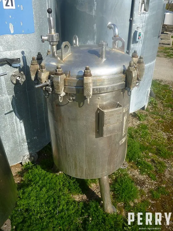 Used stainless steel vertical pressure bag filter by Schenk (Germany) type BS600. Filter is designed for work on pressure up to 6 bar at temperature up to 100C. Volume of tank 320 l. Top bolted. Filter has stainless steel screen inserts. Cake volume up to 200 l. Top feeding, bottom discharge of filtrate. Cake has to be removed manually. Machine is mounted on three stainless steel legs.