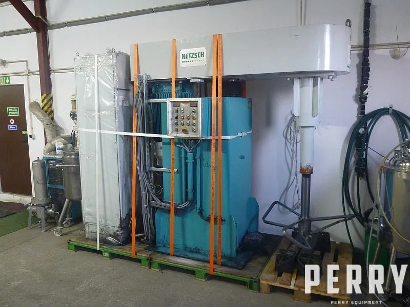 Used mixer by Netzsch (DE) type VPI 550 with butterfly/tri-foil agitator. Mixer has contact parts designed in stainless steel. Shaft has a working length 650 mm and is equipped with butterfly agitator, with three paddles and external diameter 1080 mm. Agitator is driven by el. motor 48 kW and is hydraulically risen up to about 130 cm. Machine is equipped with local control pane and electric cabinet. Machine is also equipped with hydraulicaly operated post for mixing can. Mixing pan is not included.