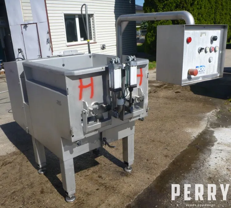 Used stainless steel twin shaft paddle mixer by Alco Food Machines (DE) model AMP 300-S with total volume of mixing chamber 330 l. Working volume of mixing chamber about 230 l. Mixing chamber has internal dimensions L 900 mm x W 805 mm x D 535 mm. Top open. Machine is equipped with two mixing shafts, each driven via gearbox and el motor 0.9/1.5 kW, 705/1415 rpm, 380/400V, 50 hz. Each shaft is equipped with two half-ribbons and seven mixing paddles. Discharge through front wall two discharge outlets, each equipped with stainless steel lid, operated pneumatically. Machine is mounted on four stainless steel legs and is equipped with local control panel. Last time used in food industry.