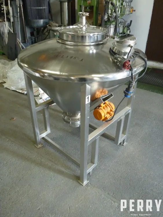 Used conical stainless steel transport container for powders by Valorel (FR) with total volume 300 l. Tank is designed in stainless steel (AISI 316L) and is mounted on stainless steel supporting frame. Silos has top central inlet/manway with diameter 400 mm. Manway has lid mounted on clamping ring. Tank has also top inspection window, diameter , equipped with lamp. At the side wall there is mounted vibrating motor 0.18 kW, 3000 t/min, 1.88 KN force, 220-240/380-415 V, 50 hz. Discharge outlet has diameter 150 mm and is equipped with manually operated butterfly valve. Last time used in pharmaceutical industry.