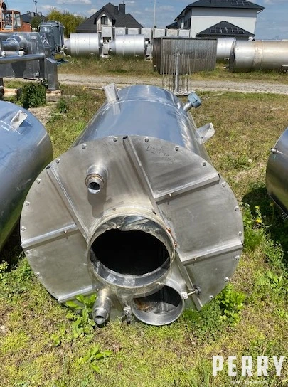 Used vertical stainless steel AISI 316 silos with a total capacity of 2930 l. Tank has internal diameter 1260 mm and length of straight side of wall 2150 mm. Bolted flat top is equipped with a central inlet with a diameter of 460 mm and an inspection manway with a diameter of 300 mm without a cover and 2 connections. Welded conical bottom is 600 mm high and has a central discharge outlet with a pneumatically operated butterfly valve by WAMGROUP type V2FS150AI with an internal diameter of 145 mm. In the conical bottom there are mounted two nozzles for blow off the cone from the inside. Silo has 1 sensor of level mounted in the lower part of the side wall. Silo is mounted on four lugs.