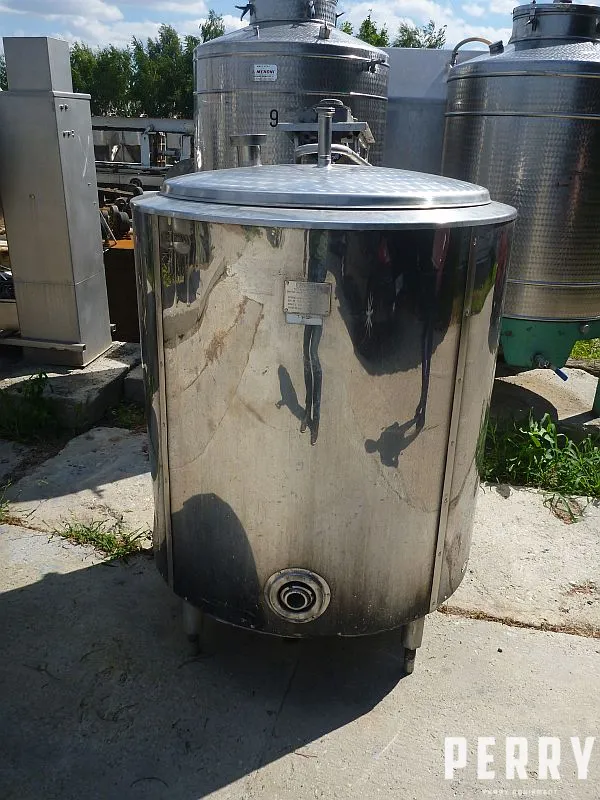 Used stainless steel jacketed vertical mixing tank by Nagema (Germany) with working volume 630 liters. Jacket is insulated and layered with stainless steel. Tank has top cover with mounted propeller agitator, manually operated. Agitator is driven by gearbox and electric motor 0.35 kW. Tank is mounted on 4 stainless steel legs. Discharge by bottom wall side outlet. Internal dimensions: diameter: 920 mm x height 950 mm. Shipping dimensions: diameter 1150 mm x height 1950 mm x weight approx. 400 kg.