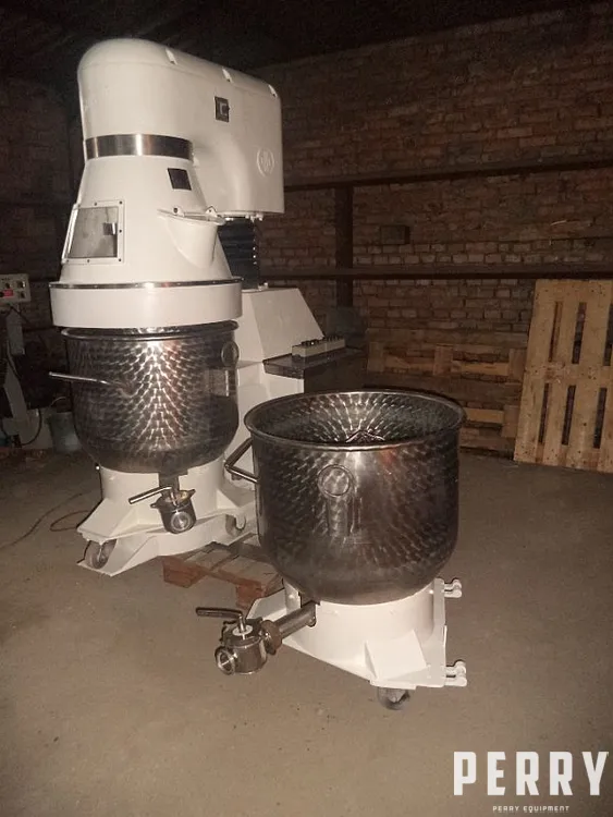 Refurbished planetary mixer by RNK (Germany) type Mixador with two stainless steel mixing pans, each with volume 220 l. Machine is driven by el. motor 3 kW. Hydraulic rising/lowering with power consumption 1.1 kW. Machine from bakery production.
