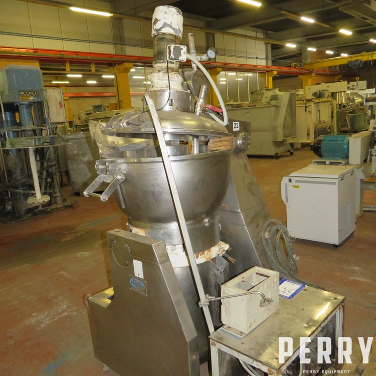 Used BIBUN Cutter Mixer-Series No. 97CP130-24-Stainless steel tank Ø 720 X 380 mm-Capacity 95 litre-Total volume 130 litre-Steel Tool-Hydraulic tilting vessel