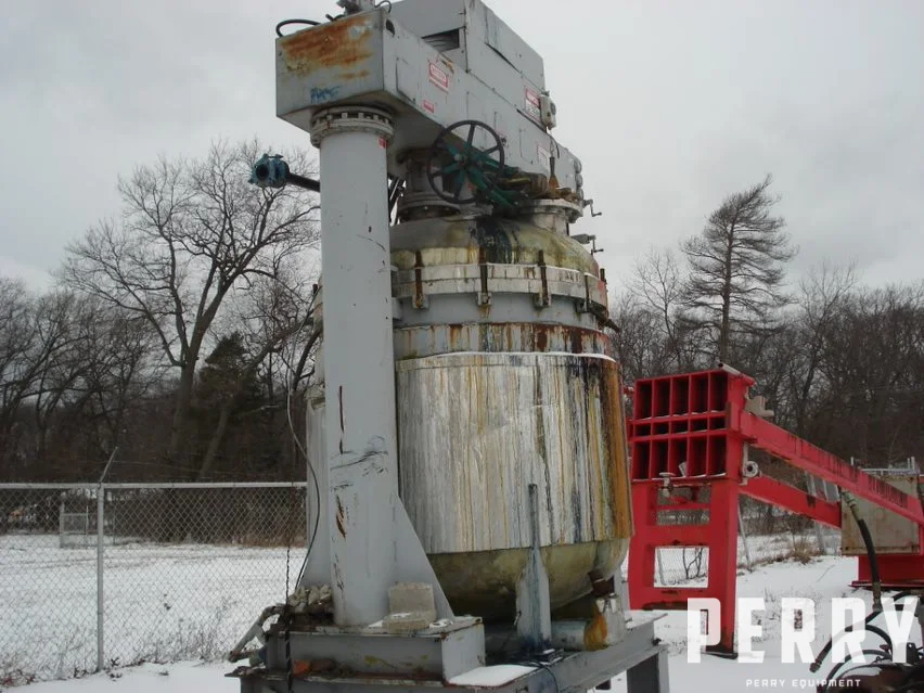 Used Myers tri shaft vacuum mixer, model HV550/800AH-30-75-75, stainless steel shaft and blades with 75 hp high speed disperser blade, 75 hp second high speed disperser blade, slow speed anchor agitator with bottom and side wall scraper driven by 30 hp motor, unit is hydraulically driven with two 75 hp 230/460 volt and one 30 hp, 230/460 volt hydraulic power packs, approx. 60" diameter x 48" straight side, dish bottom tank rated 50 psi and full vacuum at 280 f internal, jacketed for 50 psi at 280 f, air over oil hydraulic lift with air tank, vessel certified by Royal Welding Fabricators, serial# 10445, national board# 227, Myers serial# 1214, built 1994.