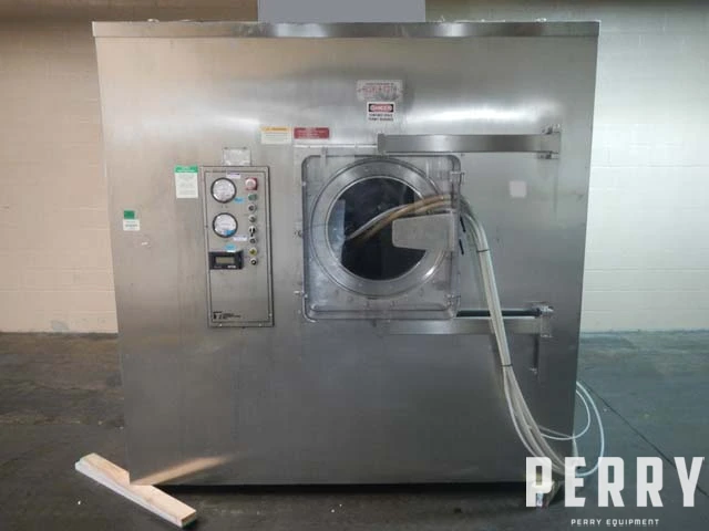 Used 66" Thomas Engineering Acela Cota model 66D stainless steel coating pan. 66" diameter perforated pan. With internal lifting baffles. 19" diameter pan opening and 62.5" pan depth. 15 HP pan motor drive. Spray guns with feed pump system. 850 kg maximum load weight. 850 liter brim volume. Stainless steel enclosure with air handling unit with approximately 25 and 60 HP blowers. Steam heated with Hepa filters. Thomas Compu coat 4 controls.